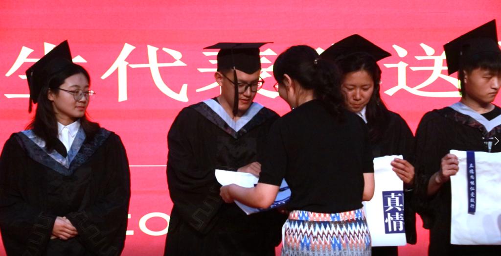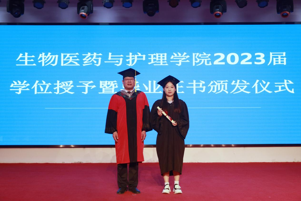 副院长徐红为毕业生代表赠送毕业礼物。赵森书记为2023届毕业生代表扶正流苏,颁发毕业证,授予学士学位并合影留念,向每一位即将走向新征程的毕业生送上最美好的祝愿。