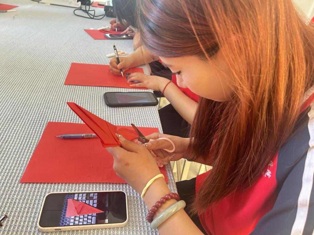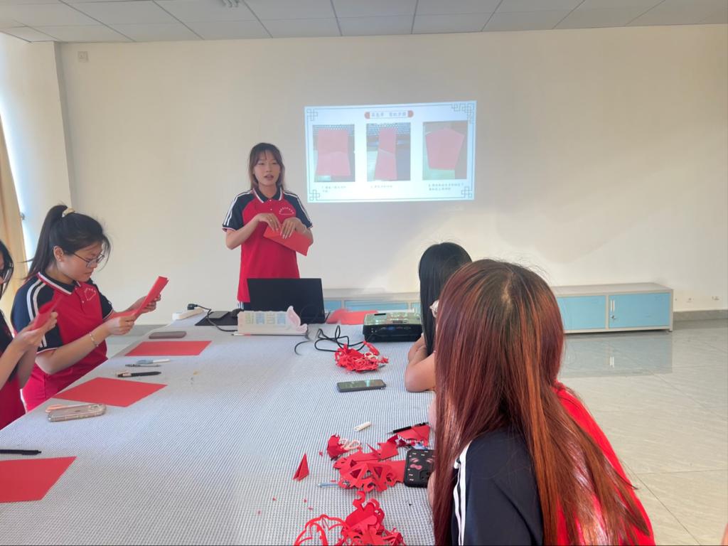 吴京瑄同学耐心细致地传授剪纸技巧,讲解制作步骤和注意事项,引导大家进行实践操作。同学们热情高涨,纷纷动手尝试,创作出各具特色的剪纸作品,在亲身体验中深切感悟民俗文化内涵。