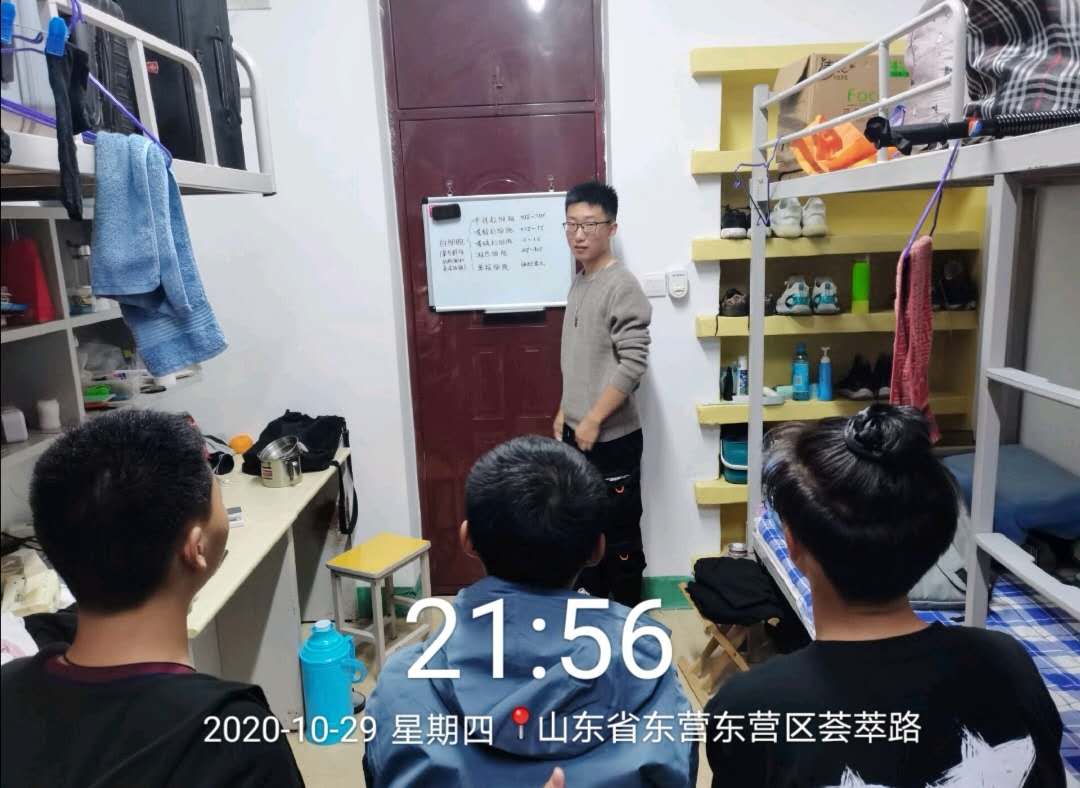 “每日一题”活动题目由各班学委总结当天上课的知识点,发送至班级群。然后每天晚上每个学生宿舍将题目写在黑板上进行分析讲解,回顾一天学习的知识点。最后,将活动照片上传至“每日一题”打卡群进行打卡。促进了各宿舍成员的团结互助,互相学习,也提高了同学们的学习精神和团队协作能力,让大家在生活中学习,在学习中寻找乐趣。