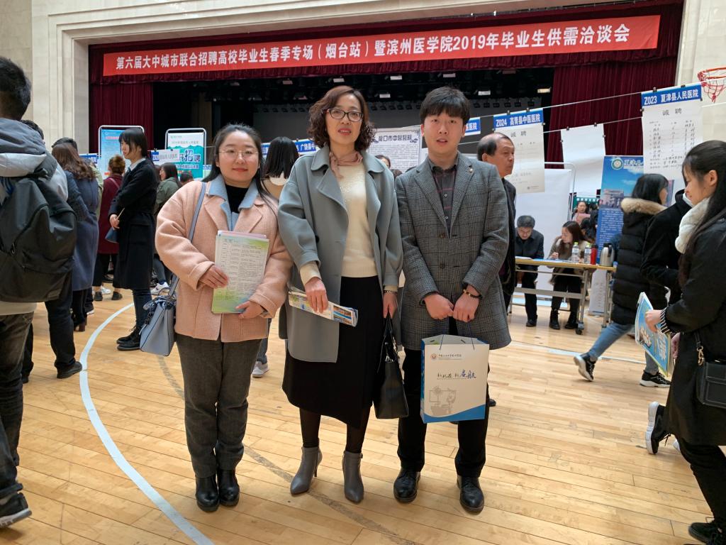 姚梅一行三人与滨州医学院护理学院党委副书记、辅导员老师就学风建设、就业推进、实习实训等方面进行交流沟通后,前往第六届大中城市联合招聘高校毕业生春季专场暨滨州医学院2019年毕业生供需洽谈会现场,与二十余家用人单位洽谈交流,为学生提供招聘信息,开拓就业市场与实习实训基地。