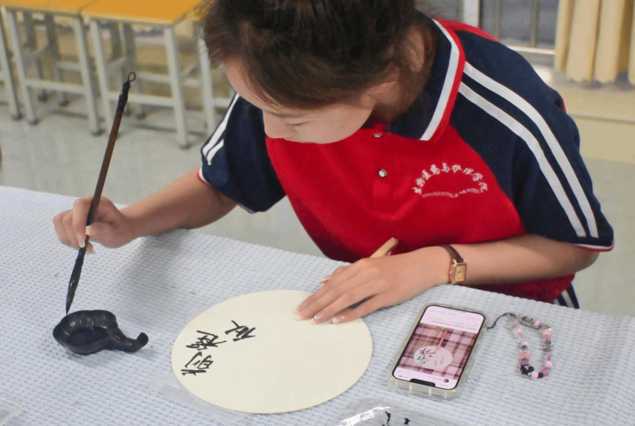马雯雯同学通过图文资料向同学们详细讲解了中国团扇文化和传统书法文化。制作过程中,同学们充分发挥自己的想象力和创造力,自主搭配彩漆,将一把把白色的团扇浸入漂漆,制作出一件件精美的作品,切身感受非遗漆扇独特的魅力。