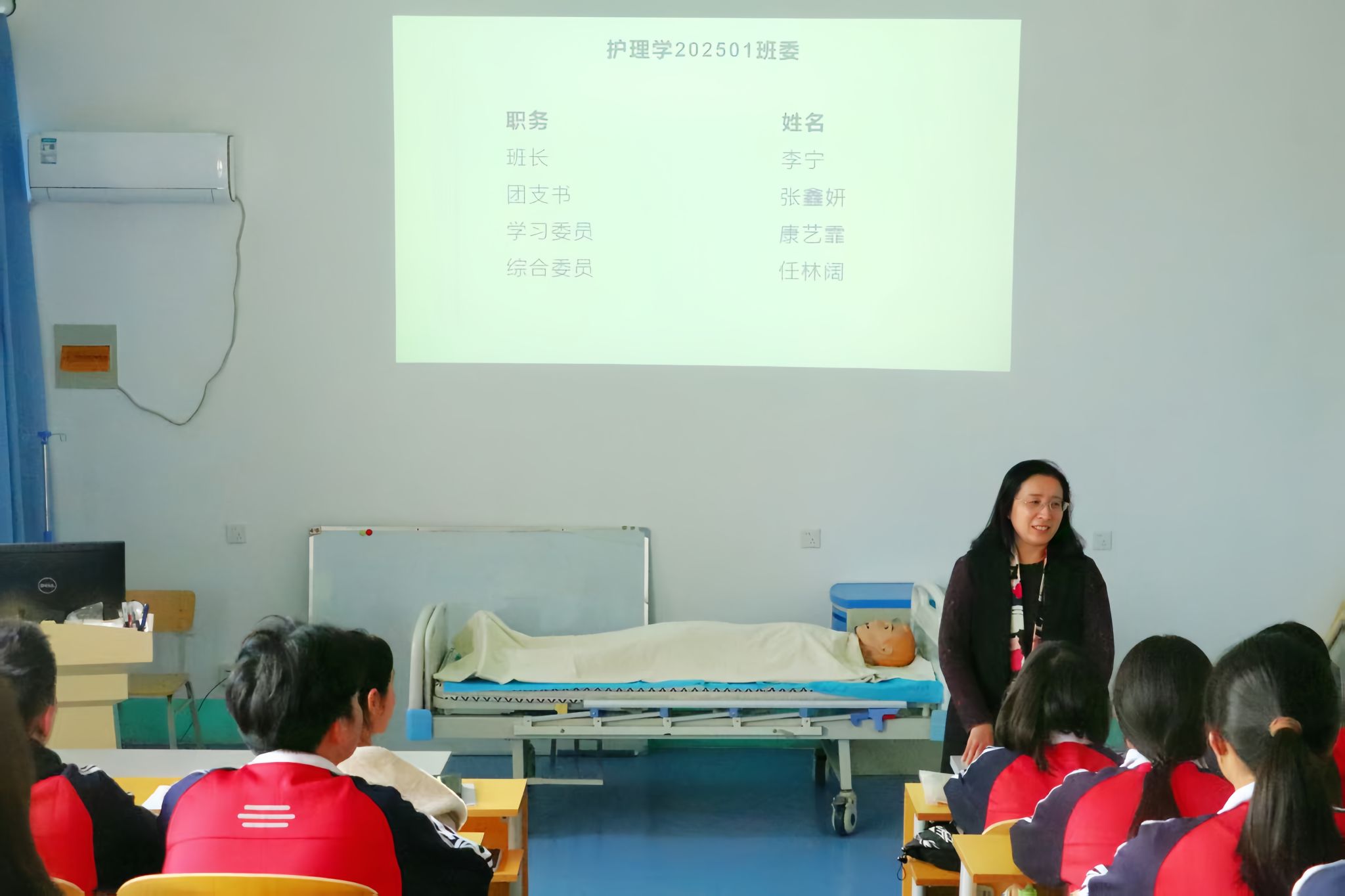 会上,师生共同观看了中华护理学会护士节宣传视频。林雪竹结合视频内容,深入剖析了护理专业学习的重点。她引导同学们深入思考,如何将人文关怀、严谨求实的精神融入大一阶段的基础课程学习中。林老师还联系学科竞赛、考研深造等未来的发展规划,着重强调了夯实学业基础对于个人成长和专业发展的重要性,极大地激发了同学们的专业认同感和使命感。随后,新当选的班委一一进行了自我介绍,班长和学习委员分别就本班近期的班级管理和学习情况进行了详细汇报。针对同学们在学习和生活中遇到的困惑与问题,林雪竹和姚新萌老师耐心倾听、细致解答,为同学们指明了努力的方向。