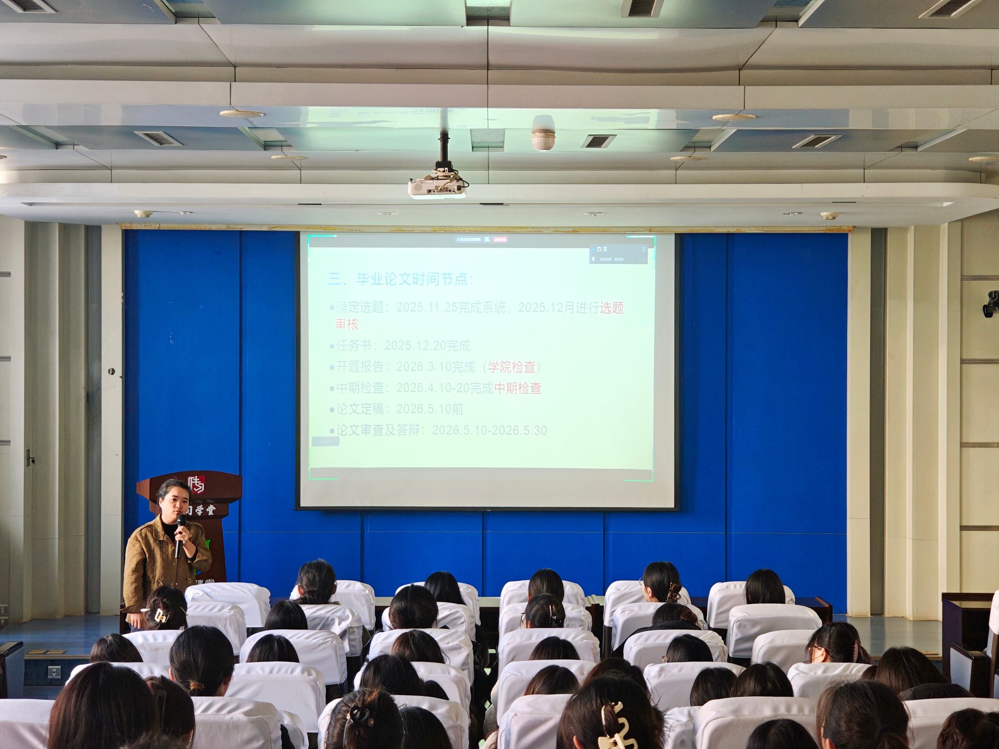 马翠翠强调,学生是毕业论文第一责任人,需主动与指导教师沟通,严格遵循学术规范。她详细说明了论文写作的全流程节点,明确论文选题、定稿查重及答辩的具体时间要求,重点讲解了论文选题核心要素、文献查阅规范等内容,并针对论文管理系统操作要点等常见问题一一进行了说明。