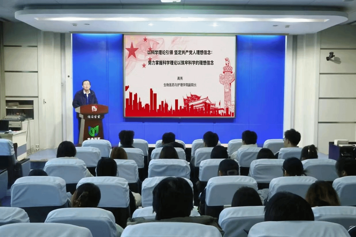高亮以“掌握科学理论是筑牢理想信念的基础”为核心,从“读原著”“悟原理”两个维度展开讲解:在“读原著”环节,他强调要深学细悟《共产党宣言》《资本论》等马克思主义经典著作,同时兼修中华优秀传统文化典籍与西方经典哲学著作,通过广泛阅读夯实理论根基;在“悟原理”部分,他指出,同学们既要领会马克思主义基本观点,又要结合中国实际与时俱进,将理论转化为契合当下实践的行动指引。高院长引用革命先辈研读经典的事例,生动诠释了理论学习对坚定理想信念的重要意义。最后,高亮勉励同学们,要以科学理论为“灯塔”,在学思践悟中锤炼党性,把理想信念融入专业学习与工作实践,以实际行动践行“强国有我”的使命担当。