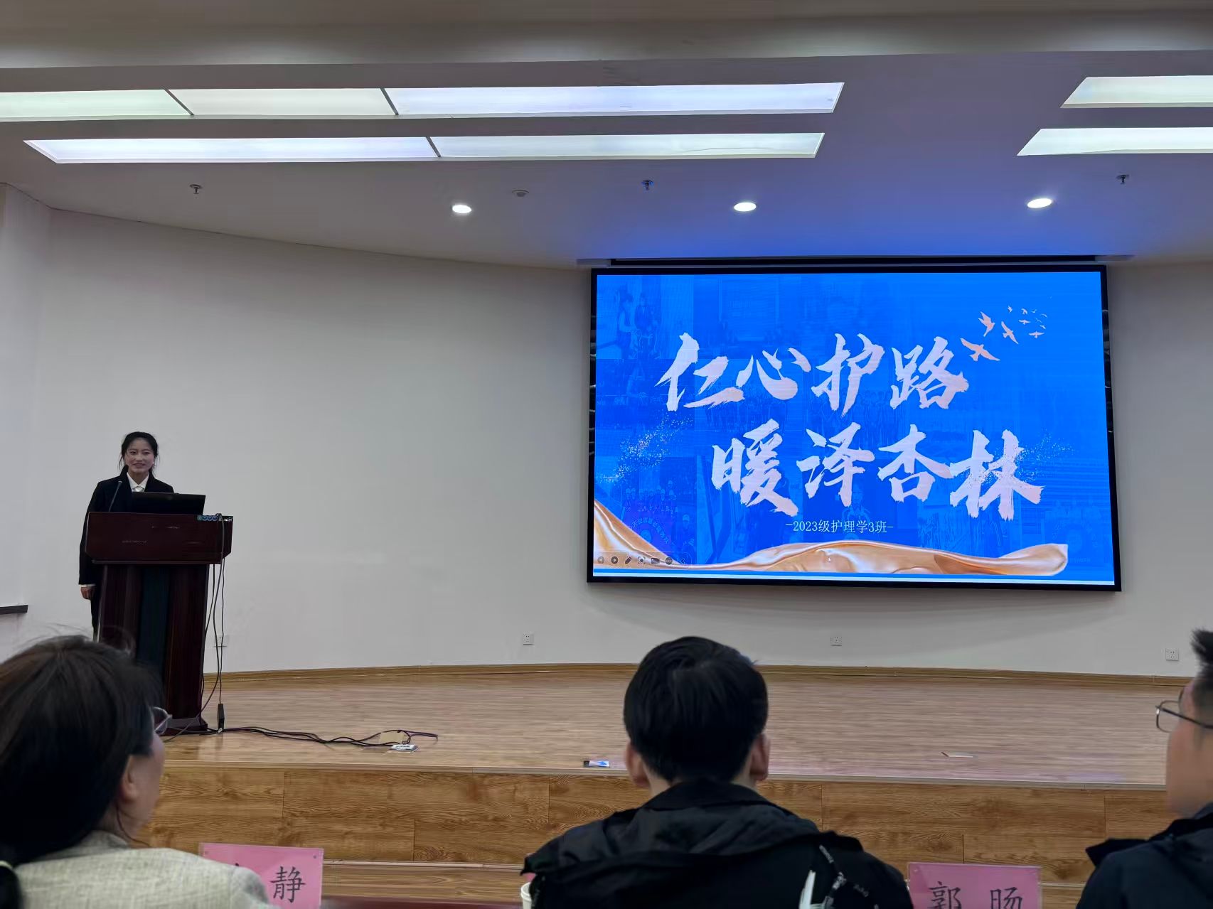 汇报中,2023级护理学3班学生代表李文洁以“雁群精神”为核心,从思想引领、学风建设、社会实践、未来规划四大方面,详细展示了班级党团共建成效、学习互助小组运行情况、奖学金获得及志愿服务开展成果。