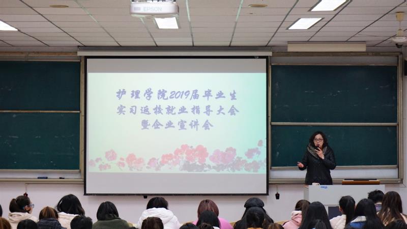 大会伊始,徐老师首先祝贺大家结束了长达十个月的实习期,其次对毕业生就业选择、就业信息服务、就业程序和手续以及其他注意事项作了详细的介绍。并根据往年就业信息中的变化情况对比,从有利因素和不利因素两方面加以分析,使学生对当前的就业形势有了更清晰的认识。徐老师以幽默风趣的语言,结合具体案例,为同学们讲述注意事项。大会最后,姚梅书记上台做总结发言,她强调:大家作为护理学院的一员,要配合,理解,支持学院的工作。要转变就业观念,了解就业形势,提升自己的技能。最后叮嘱大家,在毕业前的关键时期,提高自我人身,交通,财产安全防范意识。